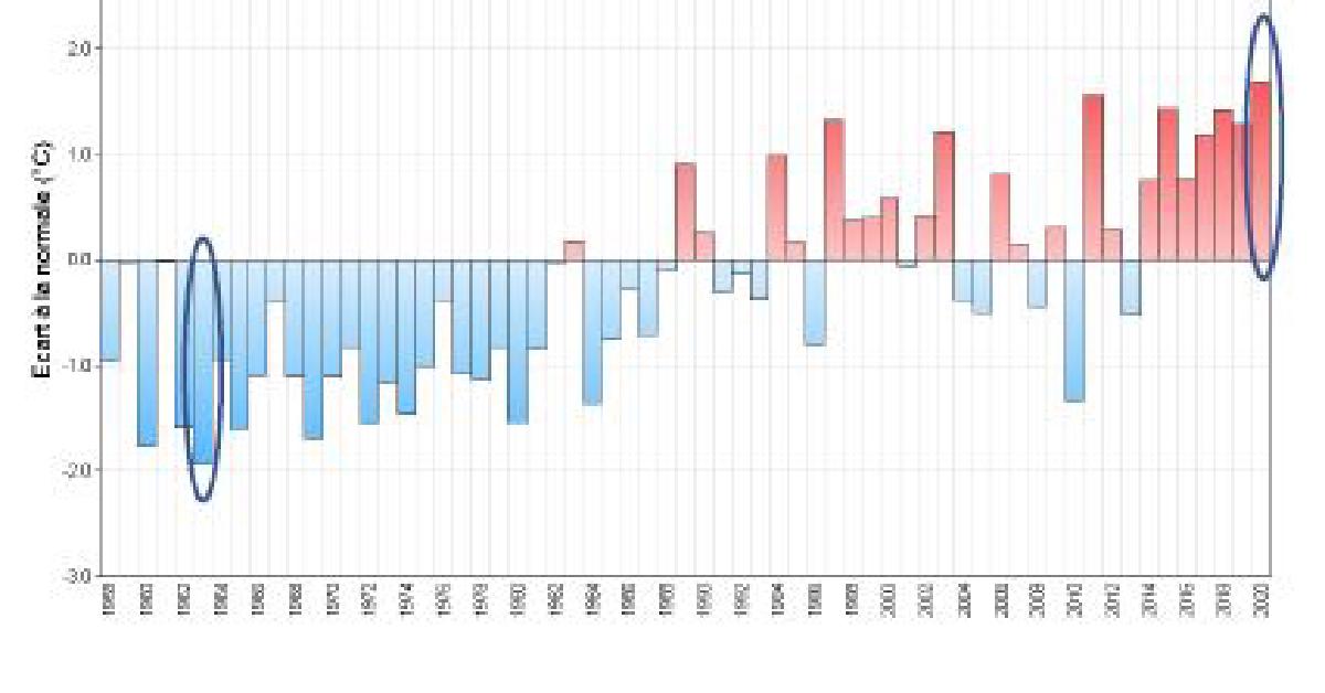 Le constat est sans appel : il fait de moins en moins froid et de plus en plus chaud à Lalouvesc, même si quelques années s’écartent de la tendance générale. 2020 est l’année la plus chaude depuis 50 ans.